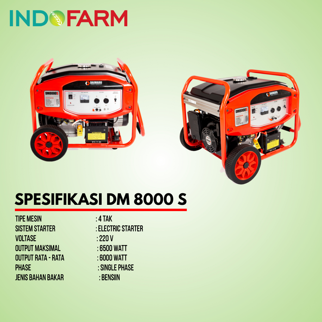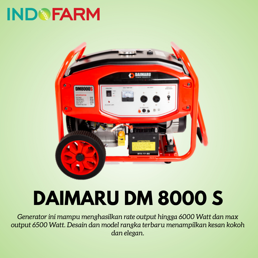 DAIMARU DM 8000 S adalah produk terbaru dari DAIMARU. Generator ini mampu menghasilkan rate output hingga 6000 Watt dan max output 6500 Watt. Desain dan model rangka terbaru menampilkan kesan kokoh dan elegan.